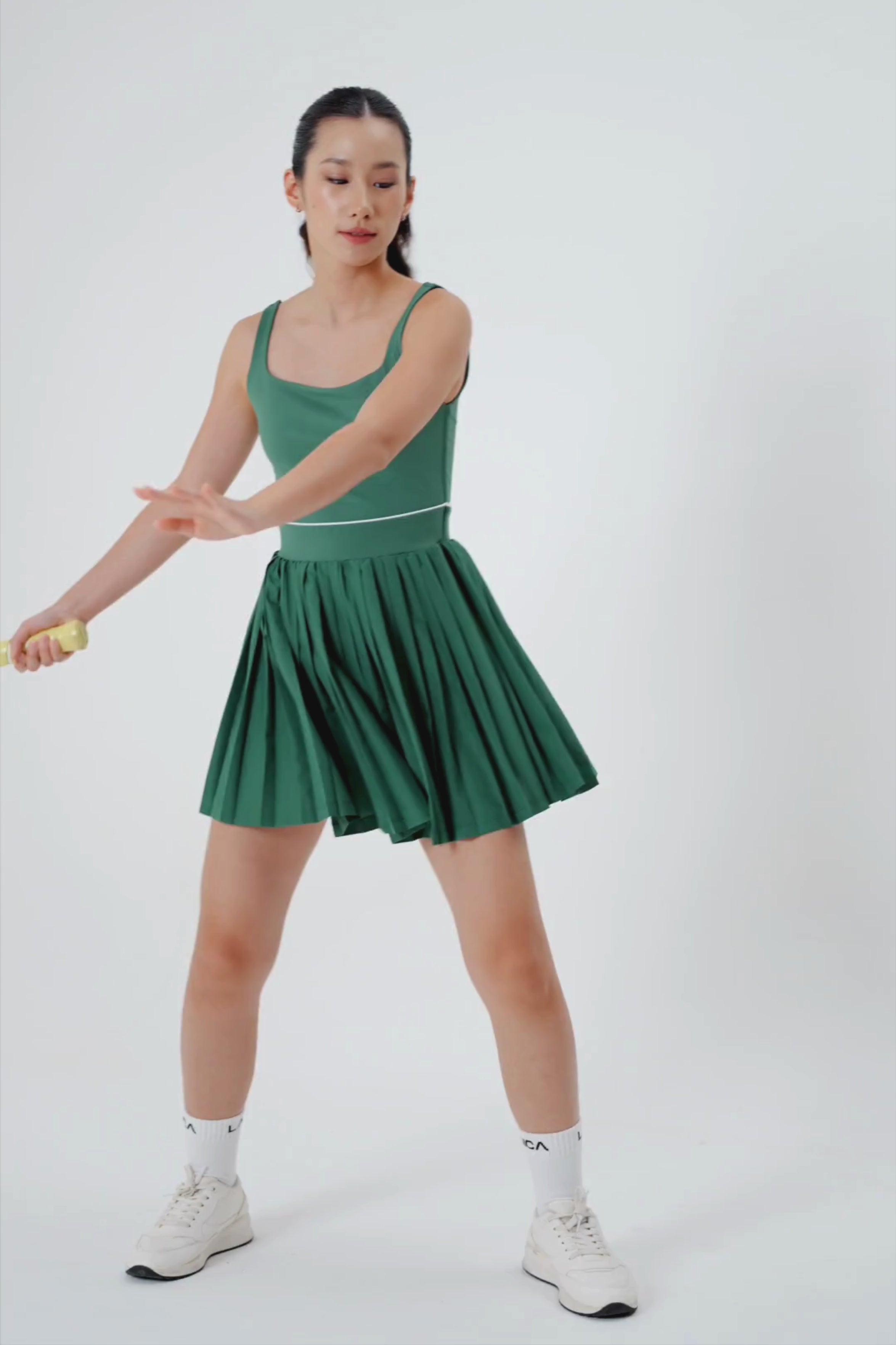 LAICA X PATRICIA DRESS — features a classic pleated tennis skirt and built-in inner shorts with a side pocket for added comfort and functionality. Made from soft, stretchable fabric that feels light and cool on the skin, allowing you to move freely. The emerald green tone adds a fresh and elegant vibe — perfect for tennis, golf, or effortless everyday wear.